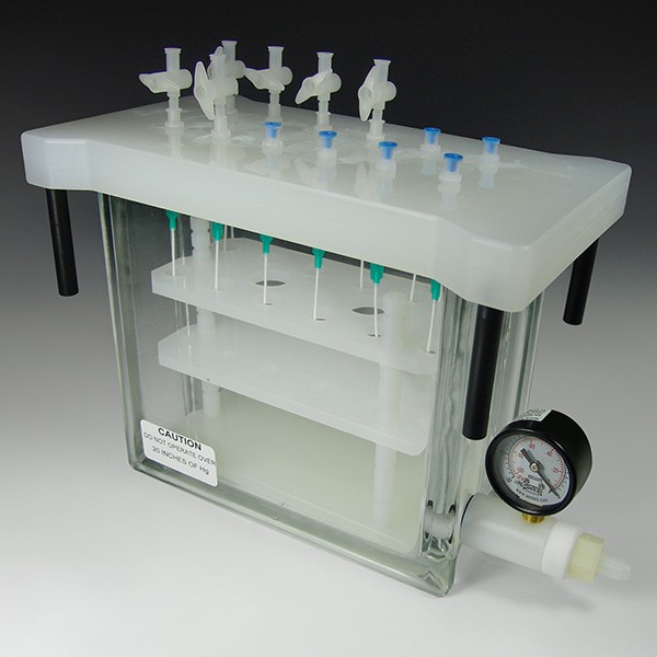 | The manifold consists of a clear glass cabinet and top to which vacuum is applied. The top is fitted with 12, 16, or 24 female luer connectors in series with a similar number of stopcock valves. These luer connectors enable the manifolds to work with any male luer-hub sample prep device.