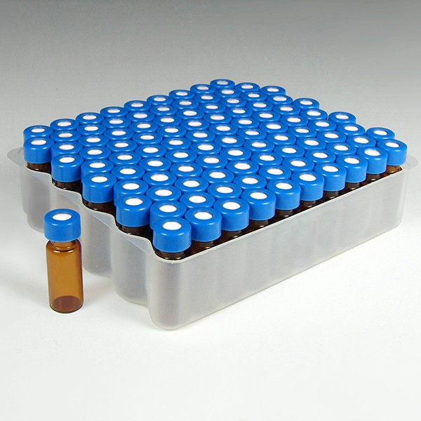 Advantage™ Pre-Assembled Vial Kit. Contains: 9mm, 2mL Amber Glass Wide Mouth Twist Vials with Step and 9mm Blue Twist Caps with PTFE/Silicone Liners