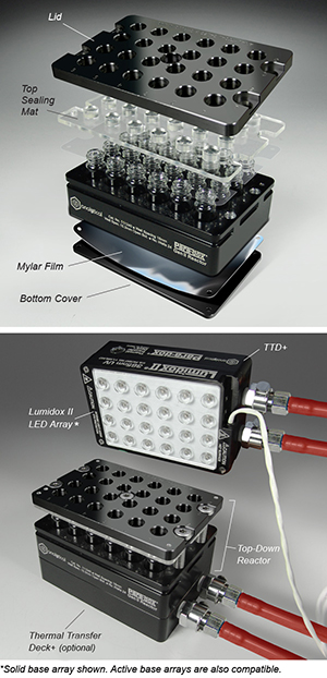 The Top-Down Photoredox Reactor provides new avenues to keep your samples cool while being irradiated by a Lumidox® II LED array. Based on the Para-dox® Gen II 24 position (18mm spacing) reaction block design, the Top-Down Reactor incorporates the following new components: